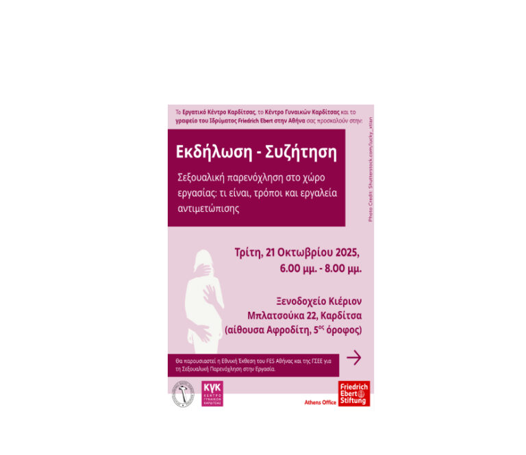 Το Εργατικό Κέντρο Καρδίτσας, το Κέντρο Γυναικών Καρδίτσας και το Γραφείο του ιδρύματος Friedrich-Ebert-Stiftung (FES) στην Αθήνα διοργανώνουν εκδήλωση – συζήτηση με θέμα «Σεξουαλική παρενόχληση