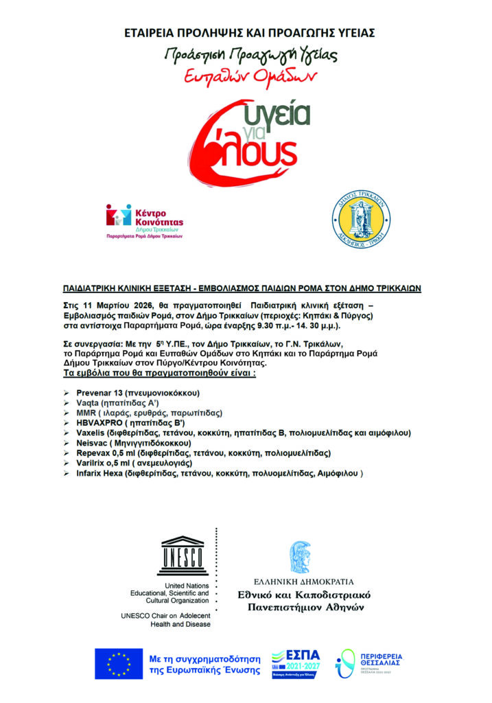 Η παρέμβαση θα πραγματοποιηθεί την Τετάρτη 11 Μαρτίου 2026 και ώρα 09:00 π.μ. – 14:30 μ.μ. στο Παράρτημα Ρομά Δήμου Τρικκαίων, στον Πύργο και στο Παράρτημα Ρομά και Ευπαθών Ομάδων στο Κηπάκι του Κέντρου Κοινότητας.