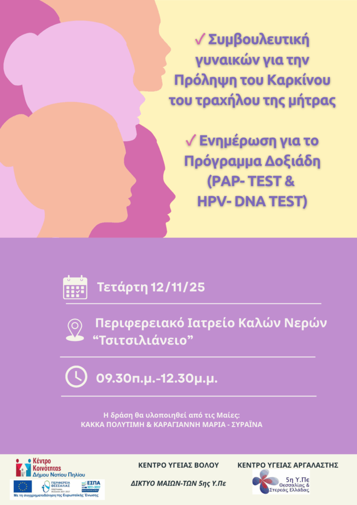 Η 17η Νοεμβρίου έχει οριστεί ως η Παγκόσμια Ημέρα Εξάλειψης του καρκίνου του τραχήλου της μήτρας. Στο πλαίσιο αυτό οι μαίες του Κέντρου Υγείας Βόλου κ. Κάκκα Πολυτίμη και κ. Καραγιάννη Μαρία-Συραΐνα, σε συνεργασία με το Κέντρο Κοινότητας Δήμου Νοτίου Πηλίου, θα πραγματοποιήσουν δράση ενημέρωσης σε γυναίκες όλων των ηλικιών για την αξία της εξέτασης Τεστ Παπανικολάου, καθώς και για την πρόληψη του καρκίνου του τραχήλου της μήτρας  μέσω του Εθνικού Προγράμματος Προσυμπτωματικού Ελέγχου (Πρόγραμμα Δοξιάδη) στο Π.Ι.Καλών Νερών, την Τετάρτη 12 Νοεμβρίου 2025 και ώρα 09.30 π.μ. – 12.30μ.μ.