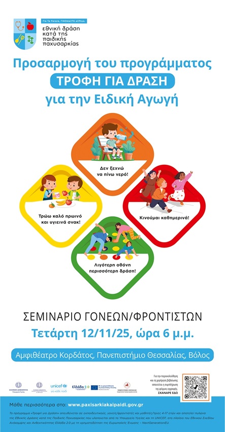 Η Unicef Ελλάδας και το Εργαστήριο Εκπαιδευτικής Νευροεπιστήμης και Αναπτυξιακών Διαταραχών του Παιδαγωγικού Τμήματος Ειδικής Αγωγής, διοργανώνουν σεμινάριο με θέμα: «Προσαρμογή του Προγράμματος Τροφή για Δράση για την Ειδική Αγωγή- Εκπαίδευση Γονέων και Φροντιστών», την Τετάρτη 12 Νοεμβρίου 2025, στις 6 μ.μ., στο αμφιθέατρο Κορδάτος του παραλιακού συγκροτήματος του Πανεπιστημίου Θεσσαλίας, στο Βόλο. Το σεμινάριο μπορεί να παρακολουθηθεί με φυσική παρουσία ή διαδικτυακά. Θα υπάρχει ταυτόχρονη διερμηνεία στη Νοηματική γλώσσα.