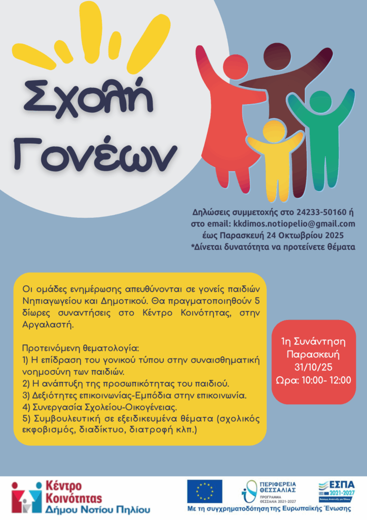 Την Παρασκευή 31 Οκτωβρίου 2025. «Η επίδραση του γονικού τύπου στην συναισθηματική νοημοσύνη των παιδιών» στις 10:00-12:00 μ.μ. Περιμένουμε όλους τους γονείς να γνωριστούμε, να συζητήσουμε και να ενημερωθούμε.